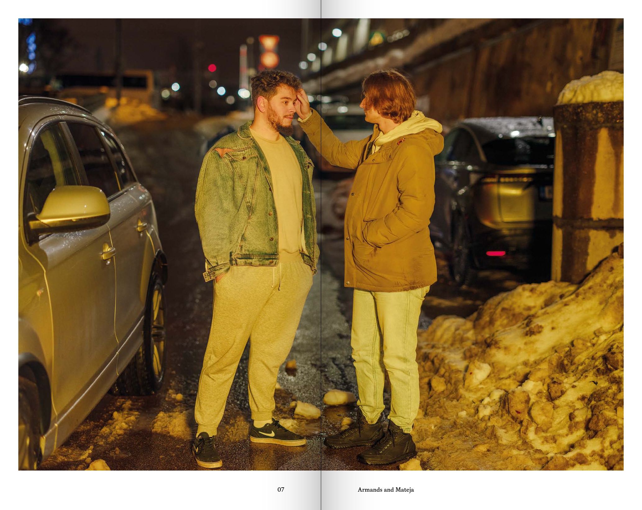 In the scenes with young people, cityscapes are bathed in warm light. Here, feelings of togetherness and belonging are palpable. Shared experiences are essential to our understanding of the world; they emerge when individuals are capable of deep empathy towards one another. These warm urban scenes attempt to bear witness to such moments and share a similar emotional terrain with the portraits of older friends. For example, the image Silent Teenagers is juxtaposed with an image in which ripe, soft plums rest on cold, hard tarmac. Together, they evoke a narrative of time and fragility, laden with memory.
